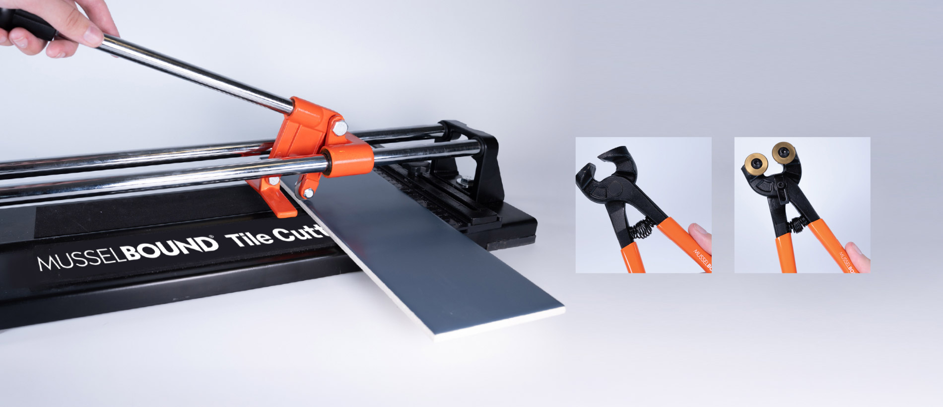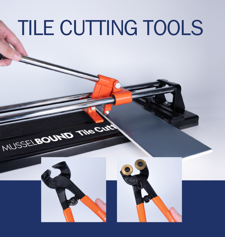 Tile cutter, tile nippers and sanding block.